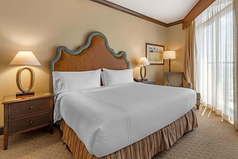 This deluxe room features a 32-inch high-definition TV, a mini-bar and a bathroom with a granite vanity and a lighted makeup mirror.